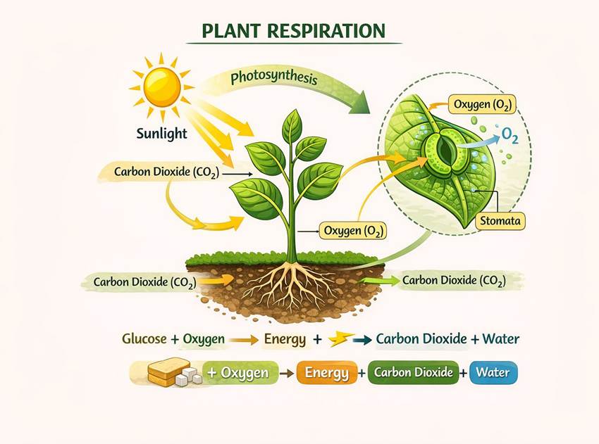 - Respiration is the process by which food (glucose) is broken down in cells to release energy needed for life activities.