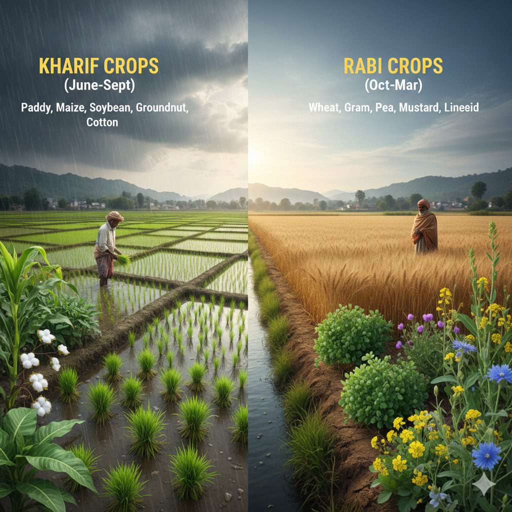 India is a vast country with different climatic conditions. Factors such as temperature, humidity, and rainfall vary from region to region. Due to this, a wide variety of crops are grown across the country. However, based on seasons, crops are broadly divided into two main types: