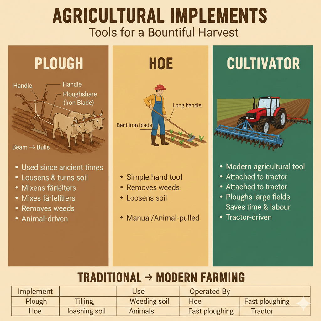 Before sowing seeds, the soil must be loosened and soil clumps broken to get a better crop yield. This work is done using agricultural implements (tools).