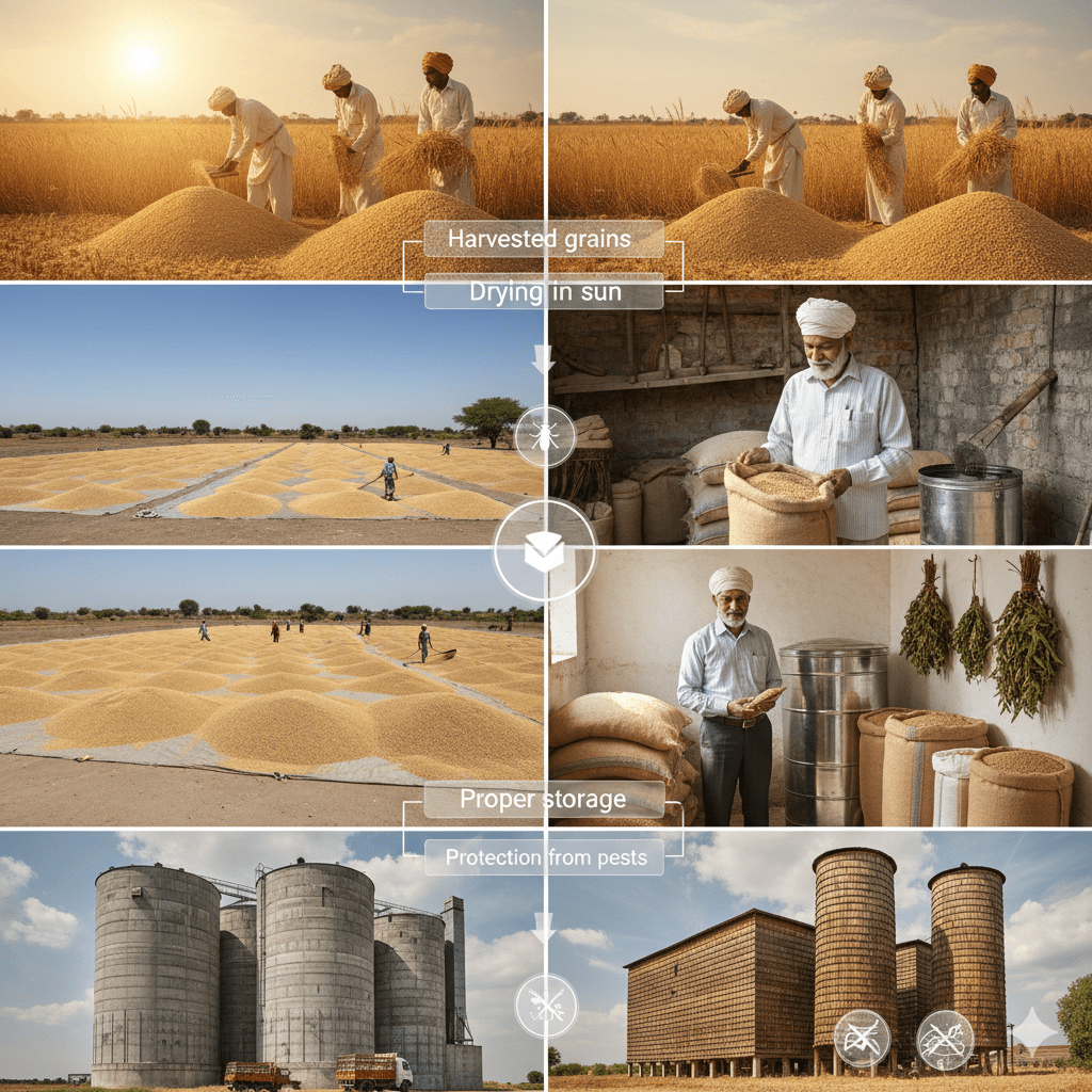 Storage is an important step after harvesting. Grains need to be stored properly so that they can be used later for food or seeds.