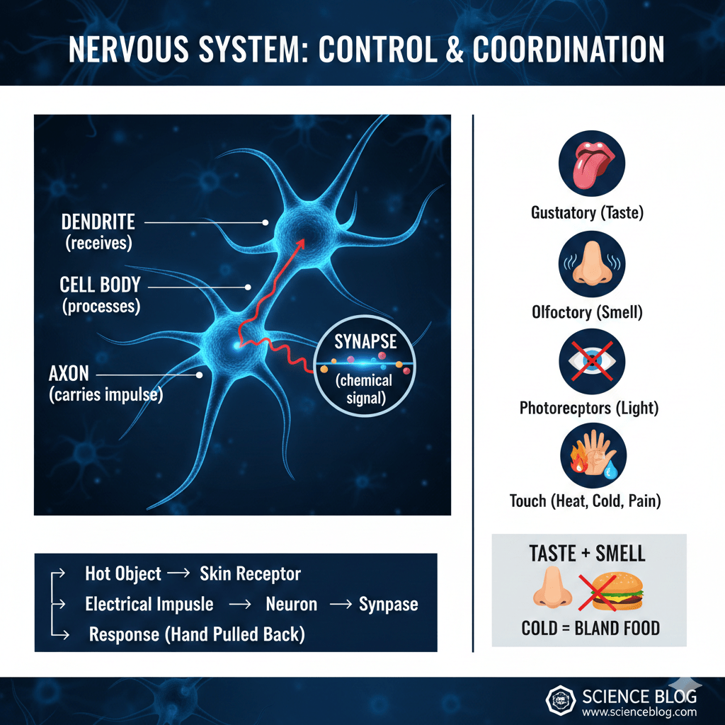 Stimulus(hot object)→Receptor in skin→ Electrical impulse is created → Dendrite → Cell body → Axon → Synapse(gap) → Chemical signal → Next neuron/muscle cell → Response (hand pulled back)
