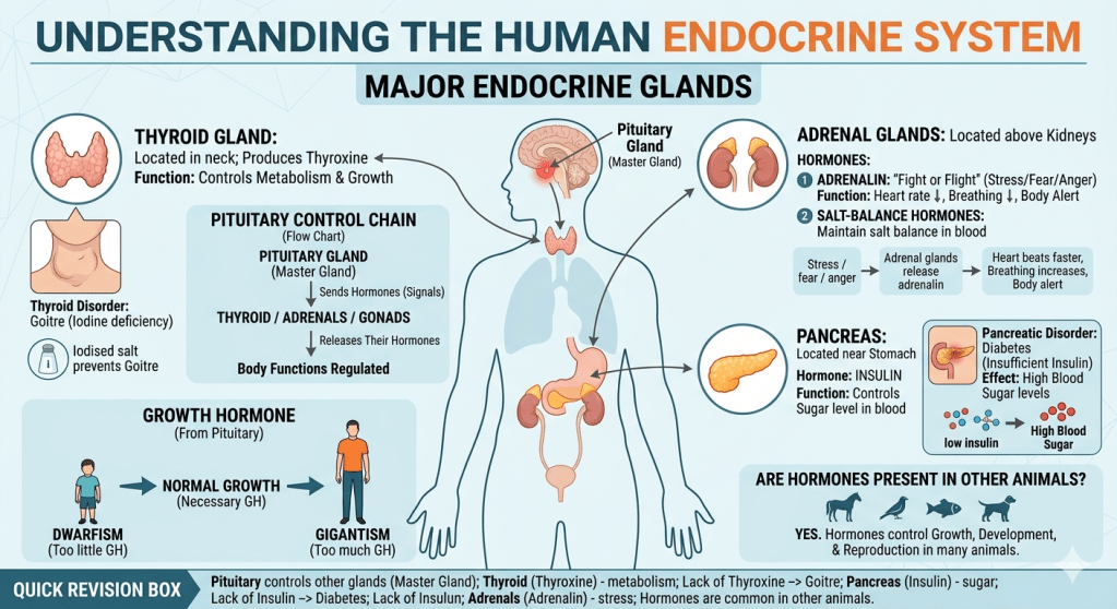 Apart from sex hormones, our body has many other hormones released by endocrine glands like thyroid, pancreas, and adrenals. The pituitary gland controls most of them. These hormones help in growth, sugar control, stress response, and body balance. Similar hormone systems are also present in other animals.