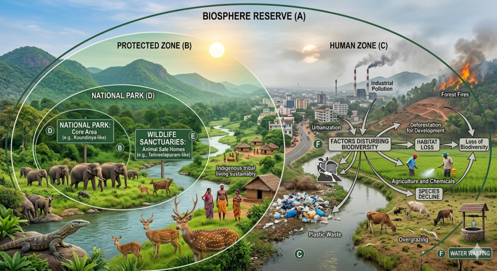 Biodiversity in my area is affected by several human activities. The main factors disturbing it are deforestation, pollution, urbanisation, overgrazing, and excessive use of chemicals in agriculture. People often cut trees for fuel and throw plastic waste in open places, which harms plants and animals. Burning crop residue and wasting water also disturb the natural balance.