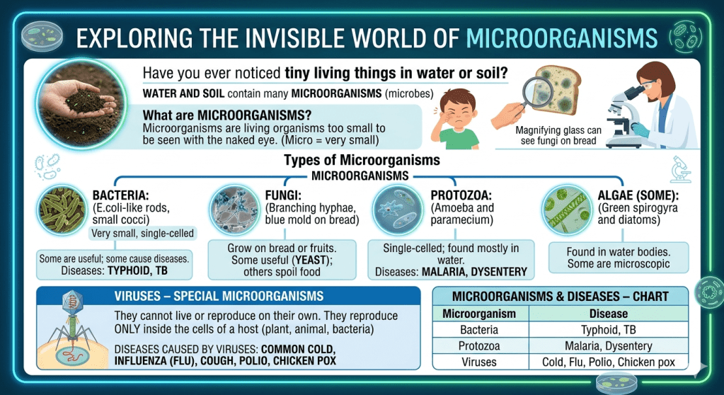 Microorganisms are very small living organisms found everywhere around us. Some are useful, while others can cause diseases. Learning about microorganisms helps us understand how diseases spread and how we can protect ourselves.